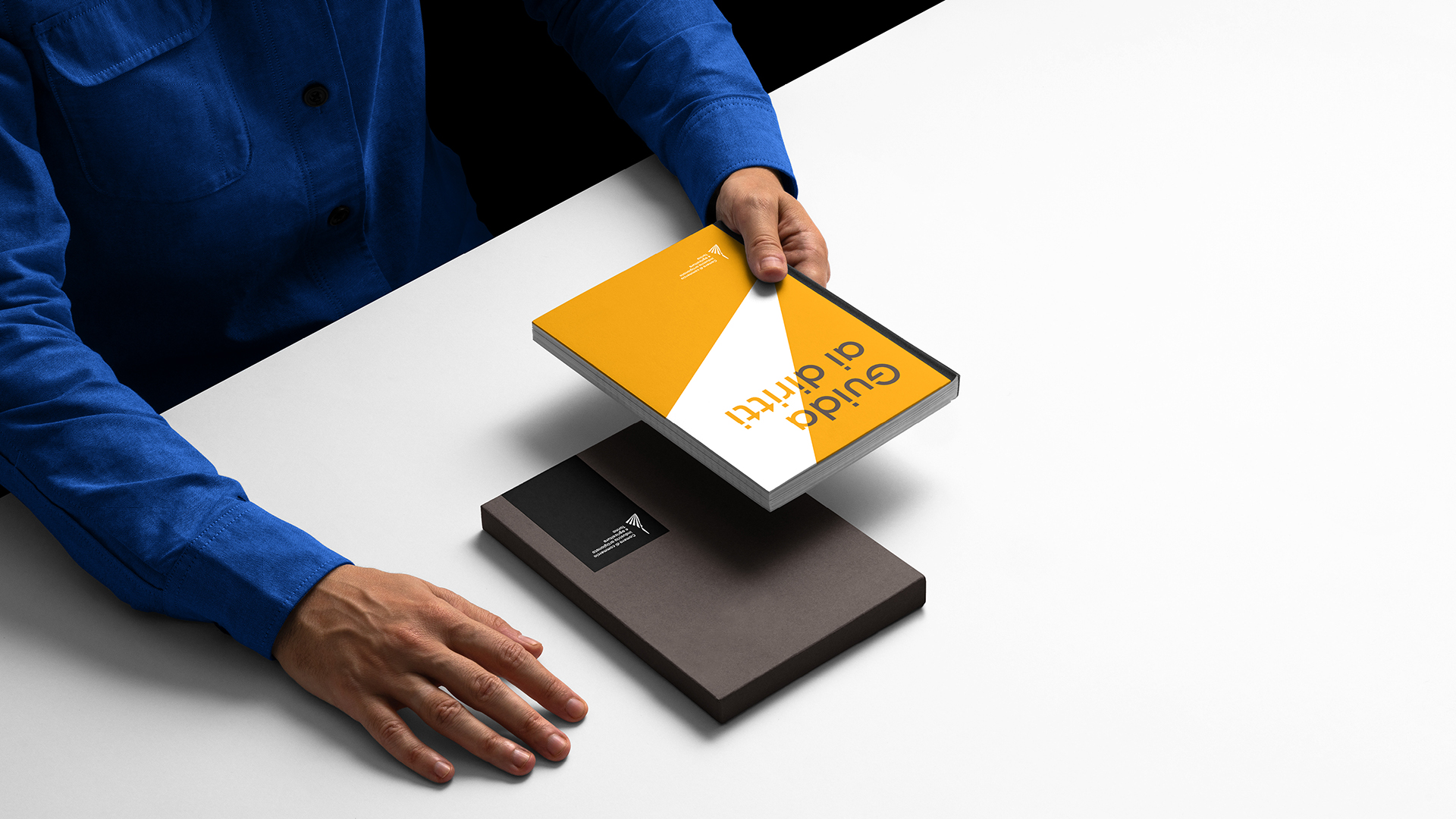 Alongside the institutional elegance of black and white, there is a reinterpretation of yellow and blue, the colors rooted in the visual tradition of the City of Turin. Two accent tones —ice gray and dark brown— enrich the palette, introducing respectively a cooler and a warmer note to complement the two primary colors. Within this refined range is the expression of a language that is sober yet contemporary, combining institutional rigor with aesthetic sensitivity.